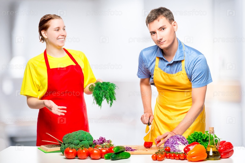 Счастливая пара готовит салат на кухне