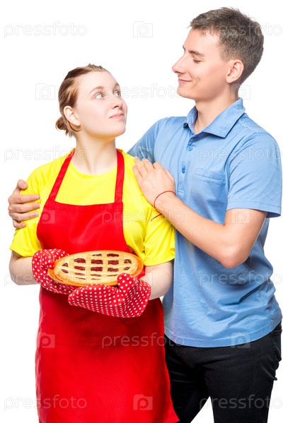 Девушка в фартуке с пирогом и ее любимый муж, портрет на белом фоне