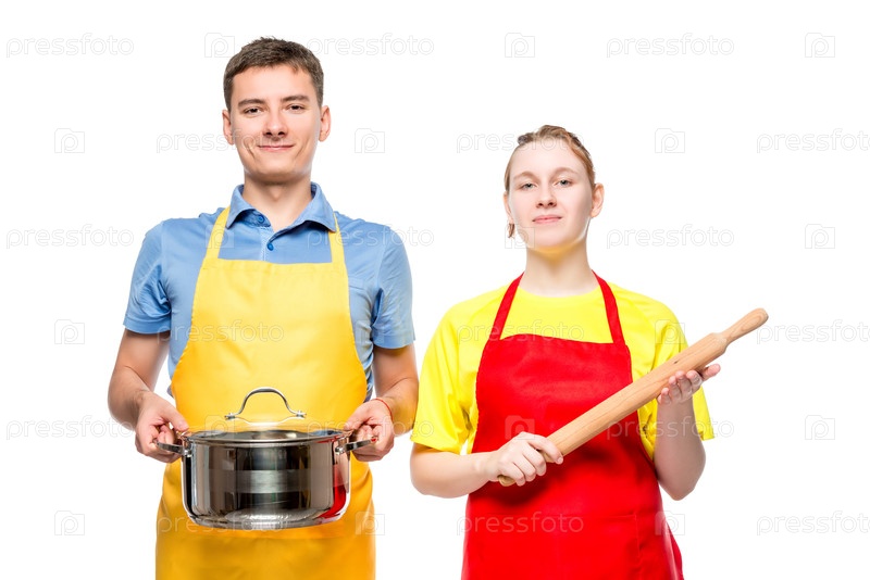 Мужчина со сковородкой и женщина с портретом на белом фоне