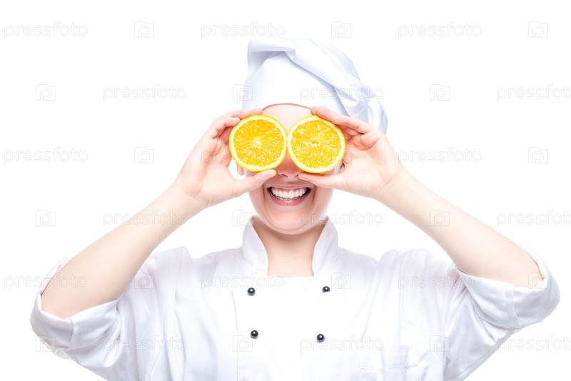 Веселый портрет шеф-повара с апельсинами на белом фоне изолирован