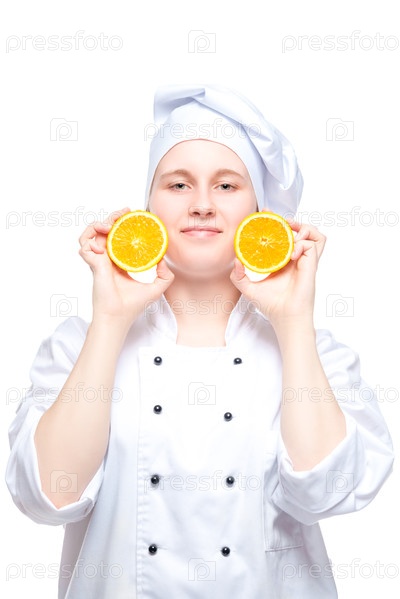Шеф-повар позирует с апельсинами на белом фоне изолированно