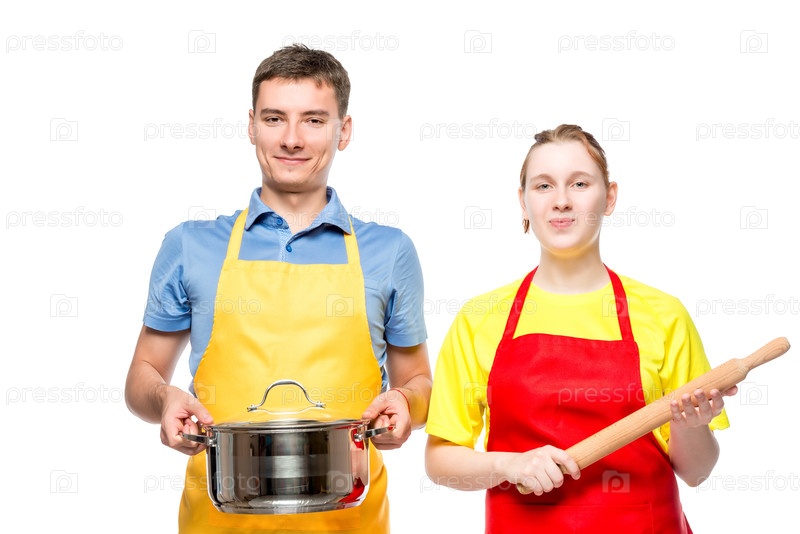 Молодой человек со сковородкой и женщина с катящейся булавкой на белом фоне