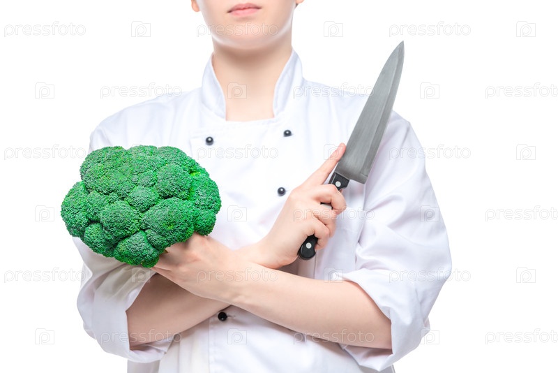 Брокколи и острый нож в руках повара крупным планом на белом фоне