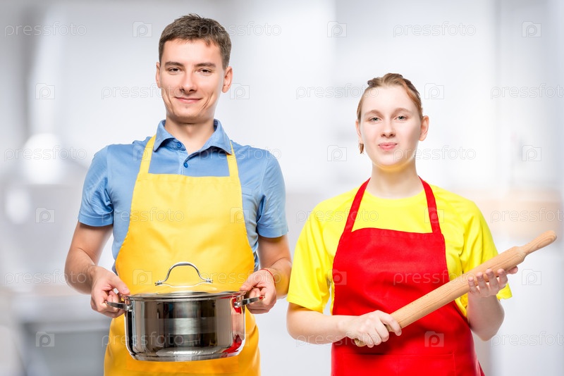 Молодой человек со сковородкой и женщина с булавкой на кухне
