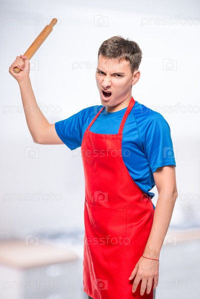 Разгневанный мужчина в фартуке с катящейся булавкой, портрет на фоне кухни