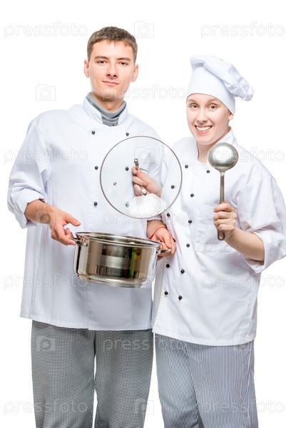 Профессиональные повара с сковородкой и ковшом на белом фоне позируют