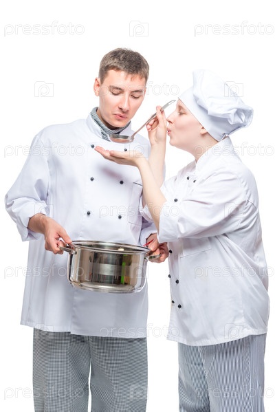 Два повара в костюмах пробуют приготовленный суп на белом фоне