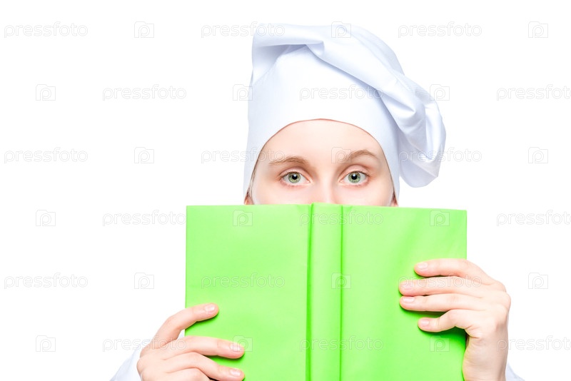 Портрет повара в кепке крупным планом, лицо покрыто книгой рецептов концепт-фото изолировано на белом фоне