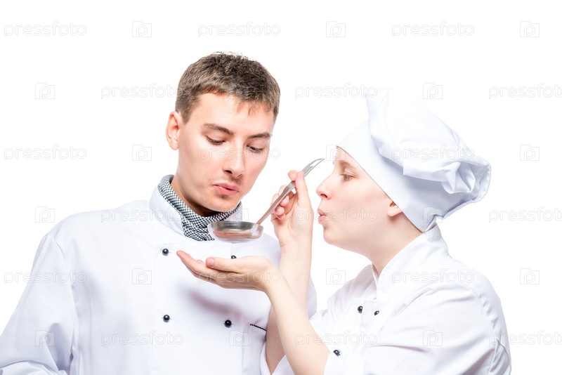 Профессиональные повара пробуют суп из ковша на белом фоне