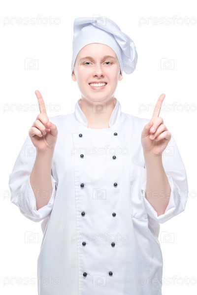 Шеф-повар выстрелил на белом фоне, жесты руками