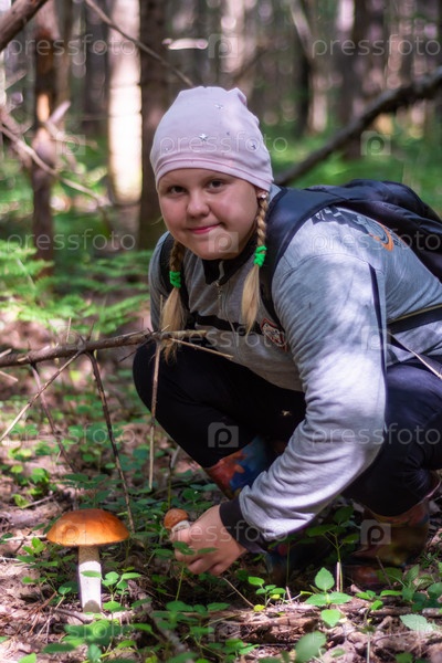 Осенью девушка собирает в лесу грибы