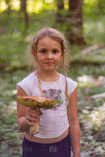 Осенью девочка собирает грибы в лесу
