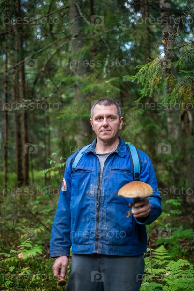 Осенью мужчина собирает в лесу грибы