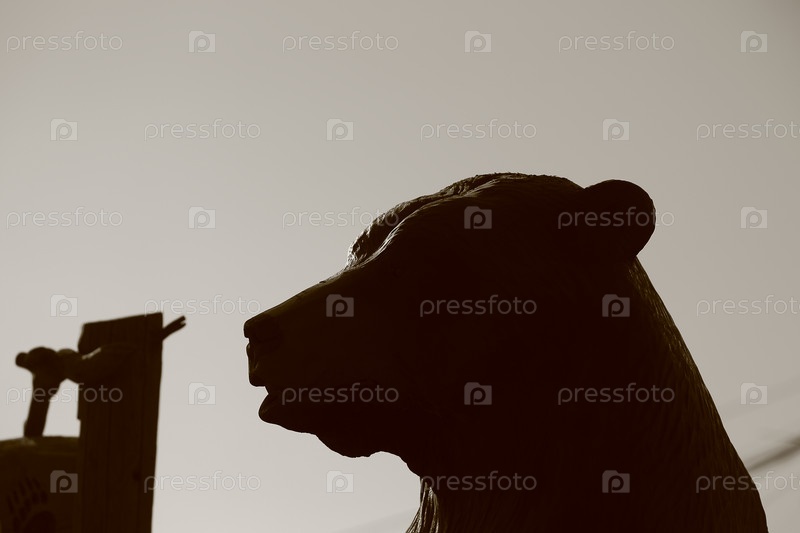 Деревянная фигура бурого медведя крупным планом. Монохром