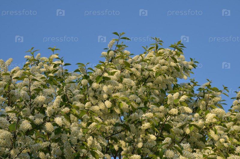 Пышное цветение черемухи на фоне голубого неба в Ботаническом саду Петра Великого в Санкт-Петербурге