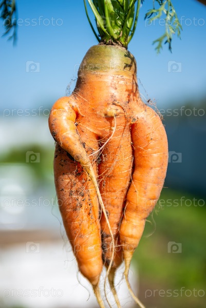 Большая морковь выросла на огороде. Осень. Сбор урожая. В саду росли большие моркови. Моркови необычной формы. Осень. Уборка. Овощи