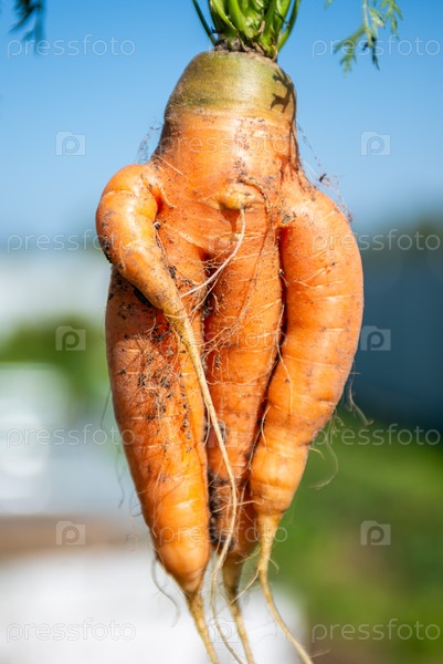 Большая морковь выросла на огороде. Осень. Сбор урожая. В саду росли большие моркови. Моркови необычной формы. Осень. Уборка. Овощи