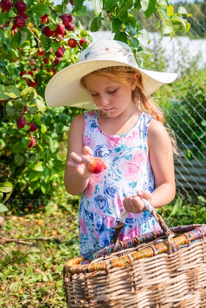 Девочка срывает с яблони сочные спелые аппетитные яблоки. Фрукты. Урожай