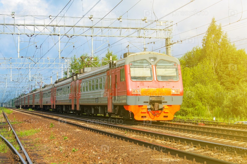 Пассажирский электропоезд, освещенный солнечным светом, движется на фоне зеленого леса