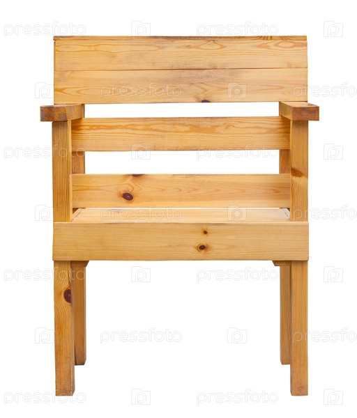 Вид спереди на деревенский широкий деревянный стул с подлокотниками, изолированный на белом фоне (элемент дизайна)