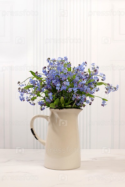 Красивые весенние незабываемые цветы в вазе на светлом фоне, флаер. Абстрактная цветочная композиция, натюрморт и шаблон для дизайна, цветочная праздничная открытка и концепция летнего приветствия,