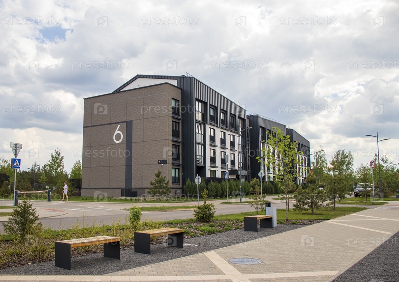 Снимок стильного, современного, городского, жилого пригорода, где здания имеют эргономичный дизайн и яркие цвета. Город