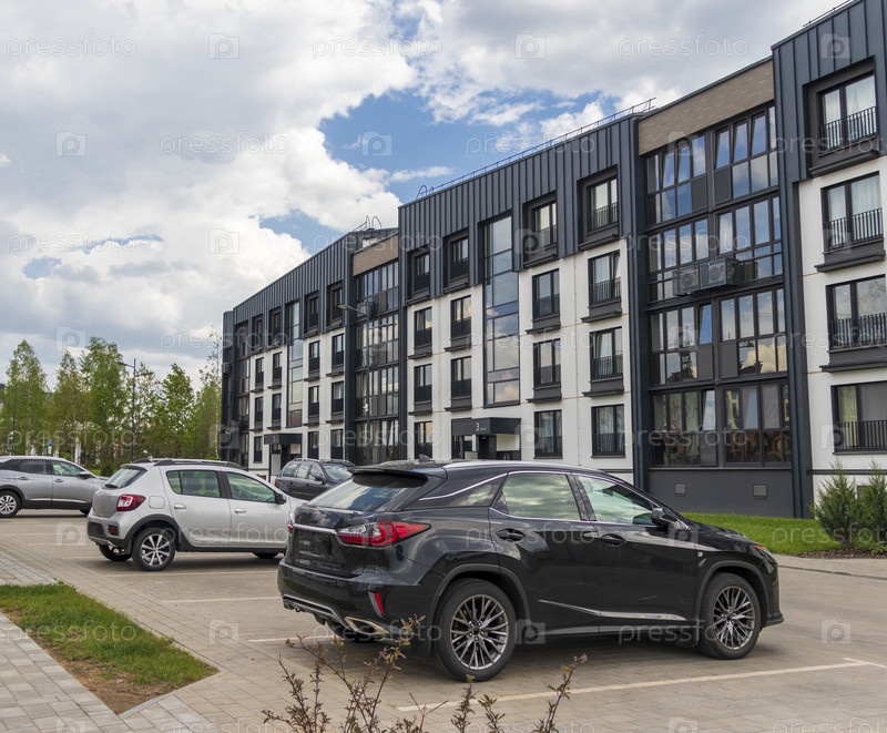 Снимок стильного, современного, городского, жилого пригорода, где здания имеют эргономичный дизайн и яркие цвета. Город