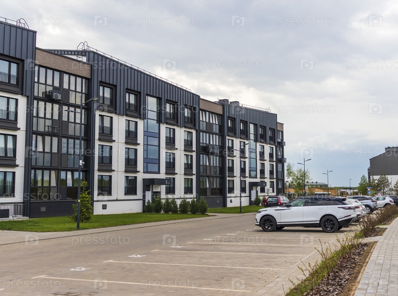 Снимок стильного, современного, городского, жилого пригорода, где здания имеют эргономичный дизайн и яркие цвета. Город