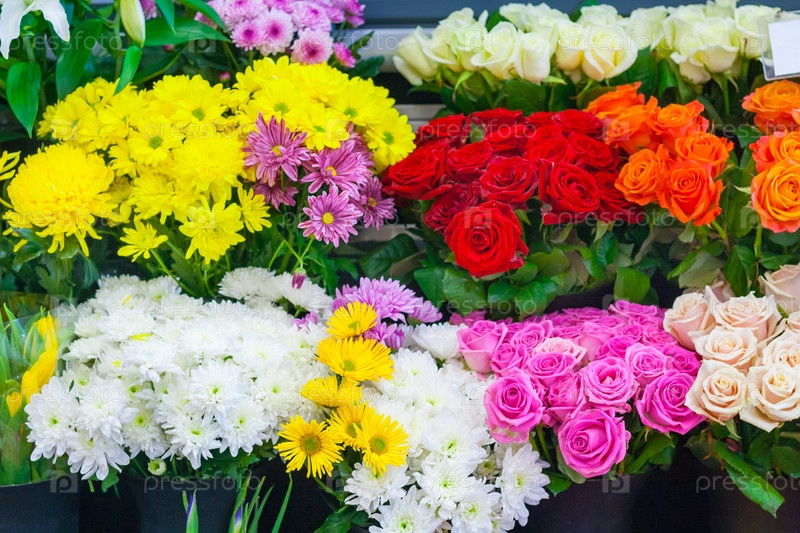 Ряды красочных букетов в цветочном магазине