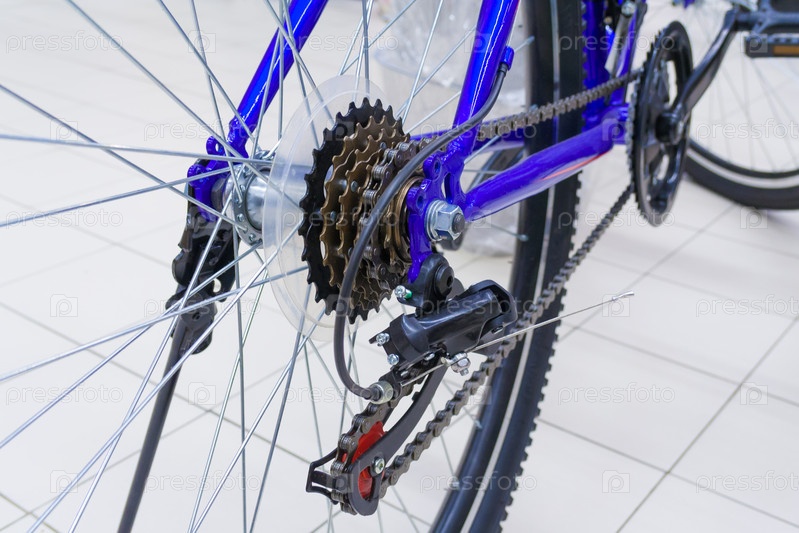 Закрыть вид на механизм велосипедных передач с цепью на заднем колесе (небольшая глубина резкости)