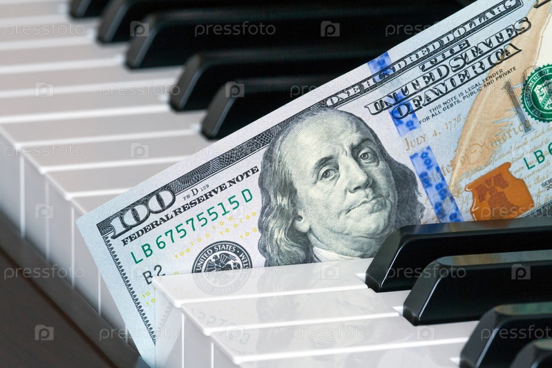 Вид фрагмента стодолларовой купюры, новый образец, вставленный в клавиши фортепиано (концепция)