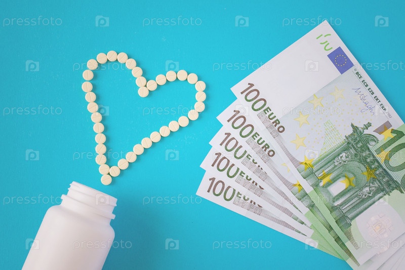 Желтые таблетки выложены в виде сердца, белой банки и банкноты в сто евро на синем фоне (концепция, плоская кладка)