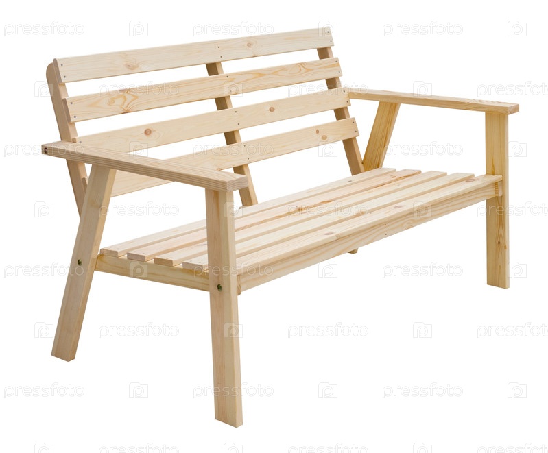 Перспективный вид широкой деревянной скамейки с спинкой, изолированной на белом фоне (элемент дизайна)