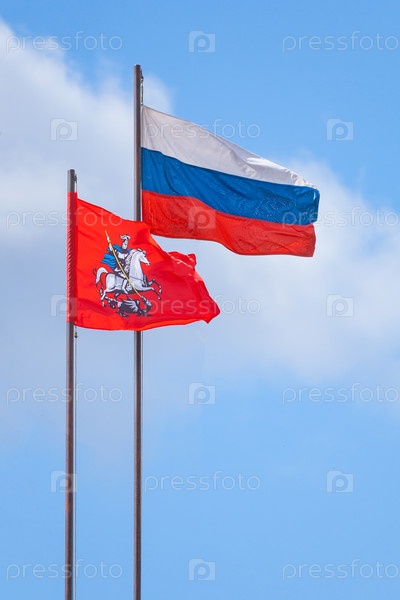 Два флага: Российская Федерация и город Москва с развевающимся на ветру гербом на фоне голубого неба