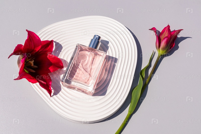 Красивая бутылка женских духов с нежным цветочным ароматом лежит на белом рельефном подиуме с весенними цветами. Вид сверху. Пустой макет бутылки
