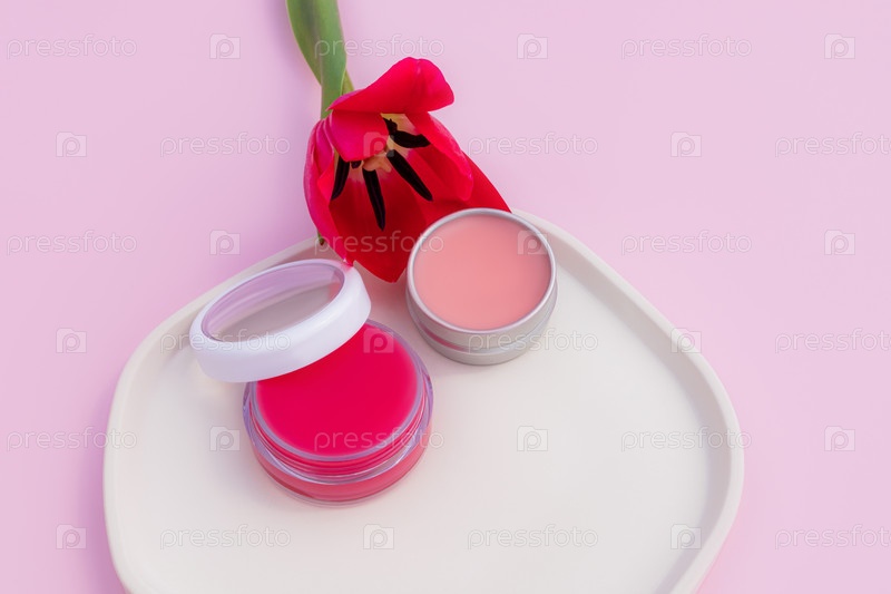 Две косметические круглые банки с натуральным фруктово-розовым бальзамом для губ стоят на подносе с тюльпаном на розовом фоне. Понятие естественного увлажнения