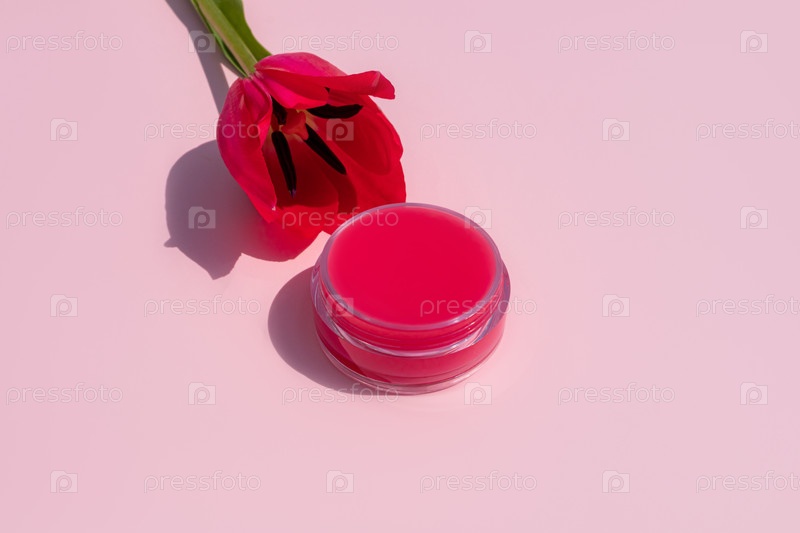 Открытая круглая банка с нежным увлажняющим, питательным бальзамом для губ, косметическая маска на розовом фоне с нежным тюльпаном. Концепция ухода за губами