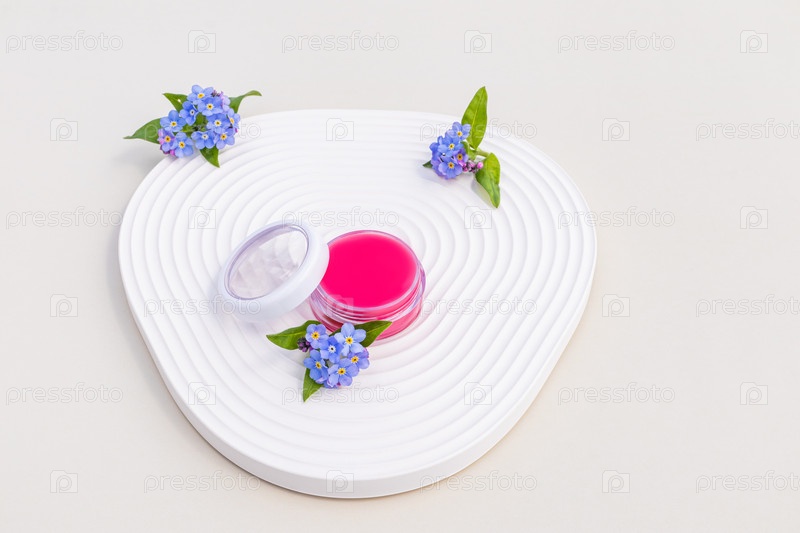 Открытая упаковка нежного розового бальзама для губ стоит на рельефном подносе с голубыми цветами. Концепция нежного ухода, питания кожи губ