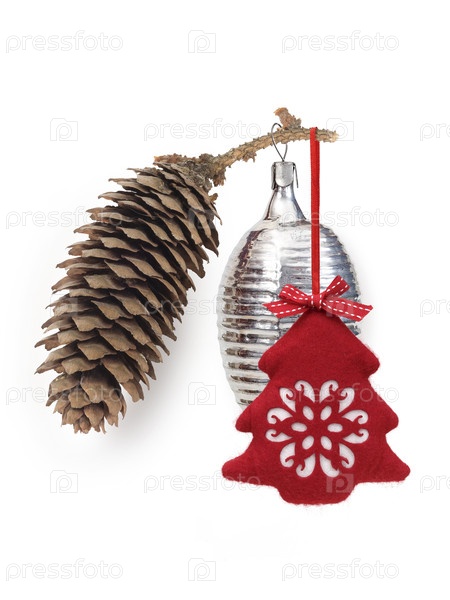 Новогодняя композиция с сосновым конусом, игрушки на елке изолированы на белом фоне
