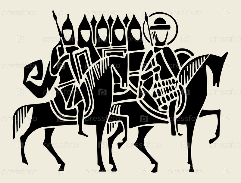 Вектор черно-белого рисунка со средневековой кавалерийской армией и святым князем