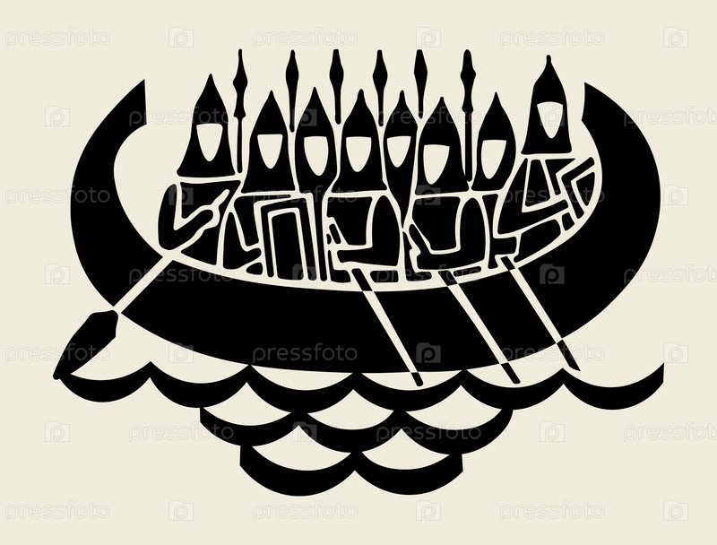Векторный черно-белый рисунок со средневековой армией на корабле