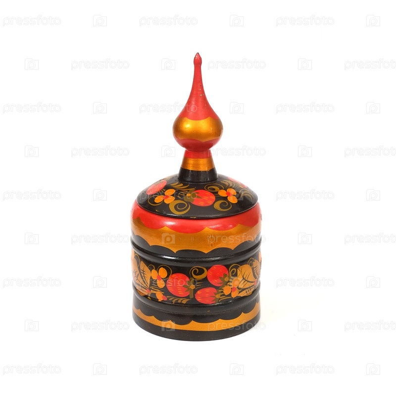 Деревянный ящик из русского города Хохлома как храм с традиционным цветочным рисунком, изолированный на белом фоне