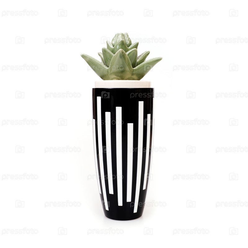 Полосатая пластиковая черно-белая ваза и керамическое суккулентное растение изолированы на белом фоне