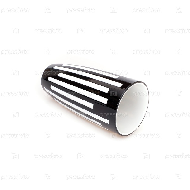 Упавшая полосатая пластиковая черно-белая ваза изолирована на белом фоне