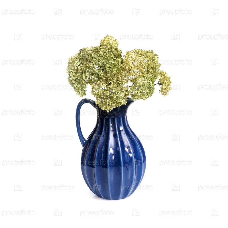 Синий керамический кувшин и зеленая гортензия выделены на белом фоне