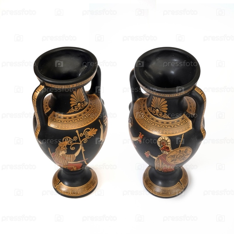 Сувенир из Греции в виде вазы выделен на белом фоне с мифологической фигурой