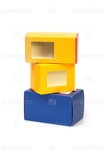 Желтые и синие упаковочные коробки выделены на белом фоне
