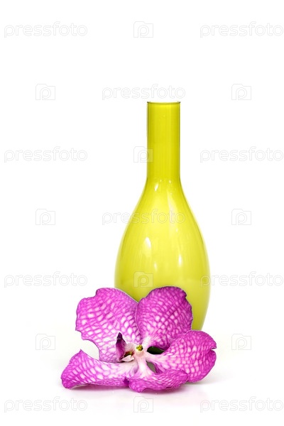 Красивая орхидея и ваза на белом фоне