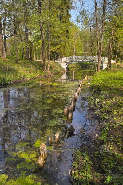 Россия, Санкт-Петербург, Гатчина, Каналы и мост Гатчинского парка в солнечный летний день