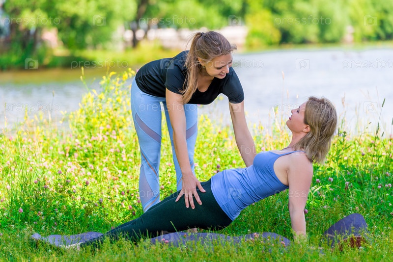 Тренер помогает правильно выполнять упражнения йоги зрелой женщине, заниматься спортом в парке летом